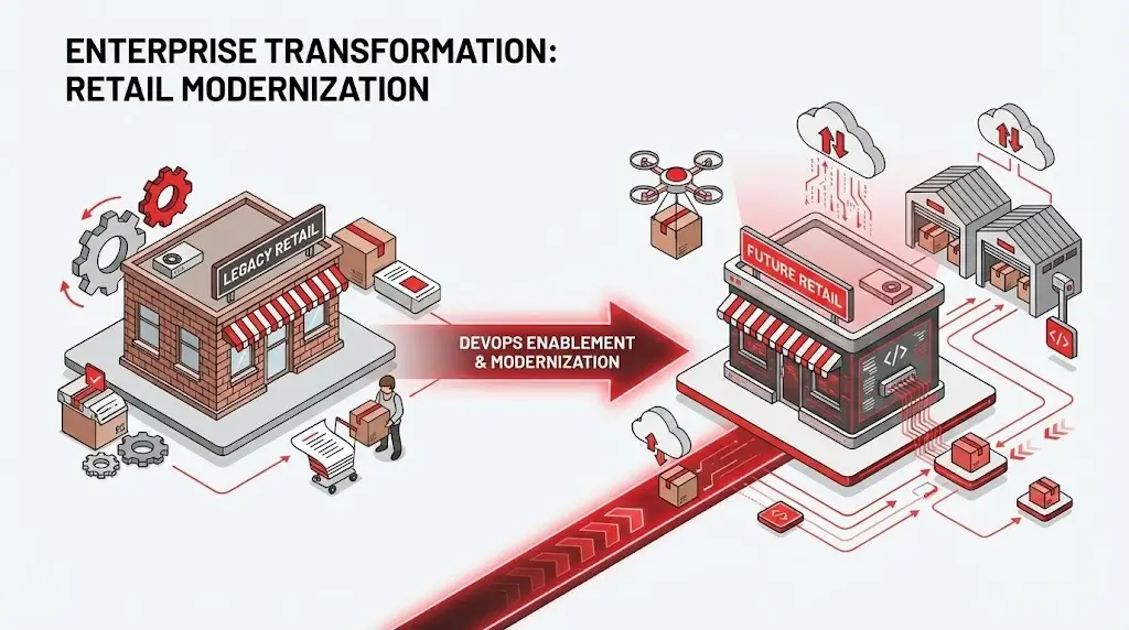 The organization needed to support both digital innovation and in-store operations, often under tight timelines and seasonal demand.Cultural inertia, siloed organizational structures, and traditional release governance models limited the company’s ability to respond quickly to evolving customer expectations and competitive pressure from digitally native retailers.