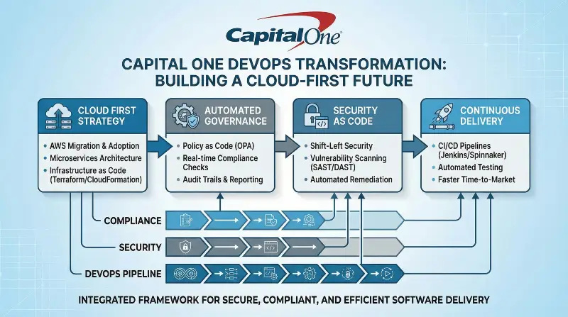 Capital One is a defining example in DevOps Case Studies within regulated industries. Capital One’s DevOps transformation directly challenges the long-standing assumption that heavily regulated industries must choose between speed and safety. As one of the largest financial institutions in the United States, Capital One operates under strict regulatory oversight, with extensive requirements related to security, data privacy, compliance, and risk management. Historically, these constraints led many financial organizations to adopt cautious delivery models characterized by lengthy approval cycles, manual controls, and limited deployment frequency. Capital One recognized that this approach was increasingly incompatible with modern customer expectations and the pace of digital competition.