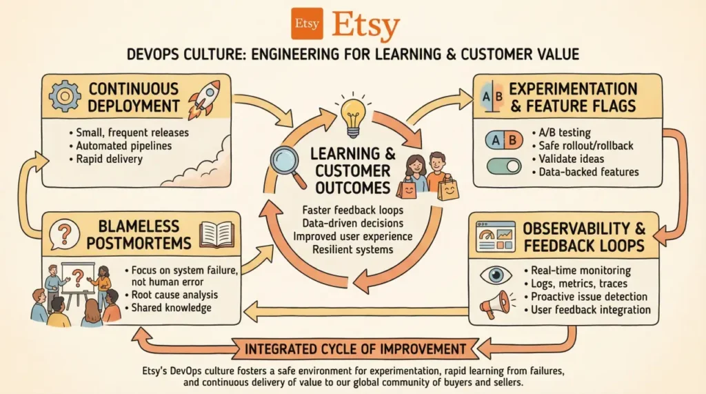 Etsy further integrated DevOps practices with business experimentation through the use of feature flags and controlled experiments. These mechanisms allowed teams to test new functionality with limited audiences, measure real-world impact, and make data-driven decisions before full rollouts. Technical changes were closely aligned with customer outcomes, reinforcing the connection between engineering work and business value. This integration ensured that DevOps was not isolated within engineering, but directly supported product strategy and customer experience.